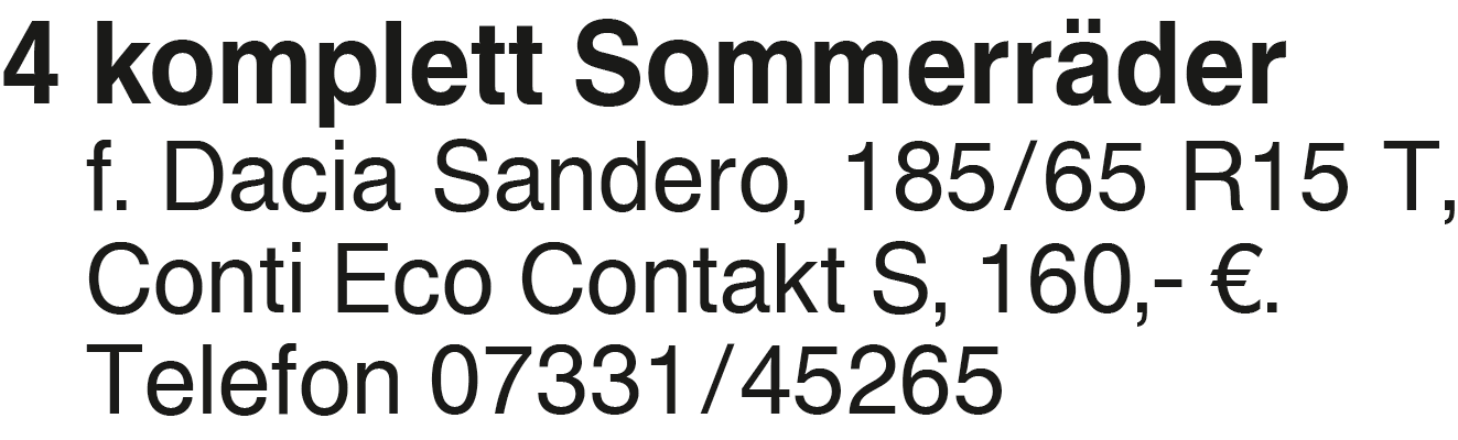 4 komplett Sommerräder f. 4 komplett Sommerräder f. Dacia Sandero, 185/65 R15 T, Conti Eco Contakt S, 160,- EUR. Telefon 07331/45265Das könnte Sie auch interessieren