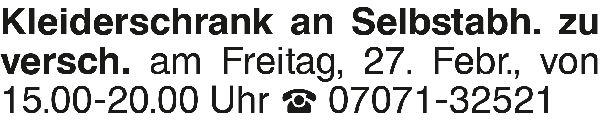 Kleiderschrank an Selbsta Kleiderschrank an Selbstabh. zu versch. am Freitag, 27. Febr., von 15.00-20.00 Uhr 07071-32521Das könnte Sie auch interessieren