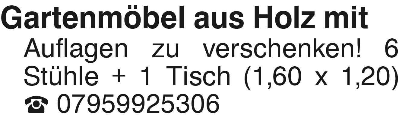 Gartenmöbel aus Holz mit Gartenmöbel aus Holz mit Auflagen zu verschenken! 6 Stühle + 1 Tisch (1,60 x 1,20) 07959925306Das könnte Sie auch interessieren