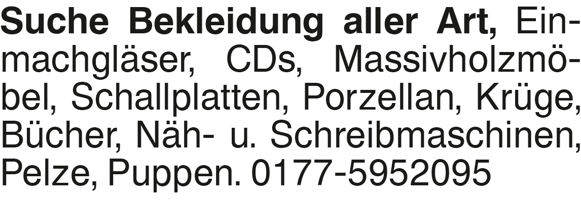 Suche Bekleidung aller Ar Suche Bekleidung aller Art, Einmachgläser, CDs, Massivholzmöbel, Schallplatten, Porzellan, Krüge, Bücher, Näh- u. Schreibmaschinen, Pelze, Puppen. 0177-5952095Das könnte Sie auch interessieren