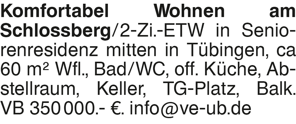 Komfortabel Wohnen am Sch Komfortabel Wohnen am Schlossberg/2-Zi.-ETW in Seniorenresidenz mitten in Tübingen, ca 60 m2 Wfl., Bad/WC, off. Küche, Abstellraum, Keller, TG-Platz, Balk. VB 350 000.- EUR. info@ve-ub.deDas könnte Sie auch interessieren