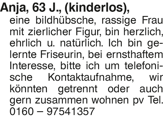 Anja, 63 J., (kinderlos), Anja, 63 J., (kinderlos), eine bildhübsche, rassige Frau mit zierlicher Figur, bin herzlich, ehrlich u. natürlich. Ich bin gelernte Friseurin, bei ernsthaftem Interesse, bitte ich um telefonische Kontaktaufnahme, wir könnten getrennt oder auch gern zusammen wohnen pv Tel. 0160 # 97541357Das könnte Sie auch interessieren