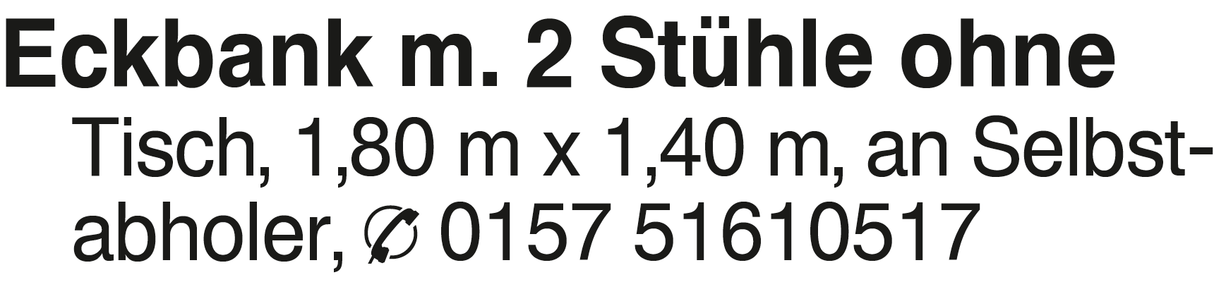Eckbank m. 2 Stühle ohne Eckbank m. 2 Stühle ohne Tisch, 1,80 m x 1,40 m, an Selbstabholer, 0157 51610517Das könnte Sie auch interessieren