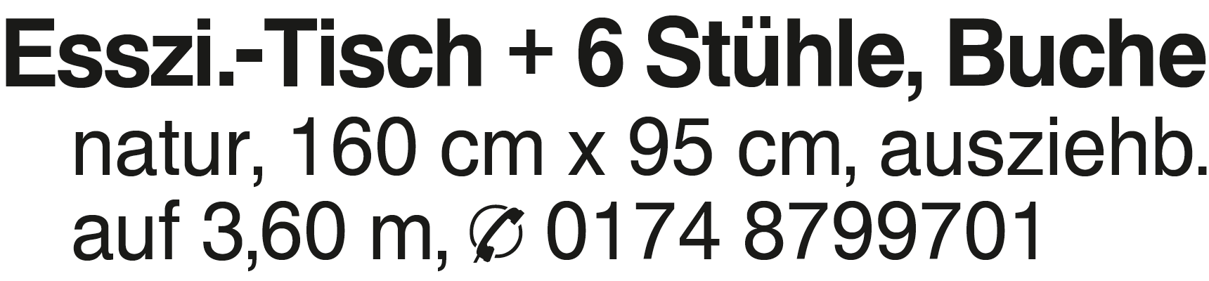 Esszi.-Tisch + 6 Stühle, Esszi.-Tisch + 6 Stühle, Buche natur, 160 cm x 95 cm, ausziehb. auf 3,60 m, 0174 8799701Das könnte Sie auch interessieren