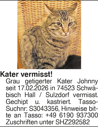Anzeige vom 11.3.2026 in der Rubrik "Entflogen / Entlaufen"