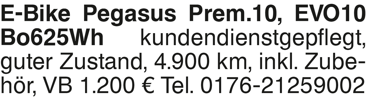E-Bike Pegasus Prem.10, E kundendienstgepflegt, guter Zustand, 4.900 km, inkl. Zubehör, VB 1.200 EUR Tel. 0176-21259002Das könnte Sie auch interessieren