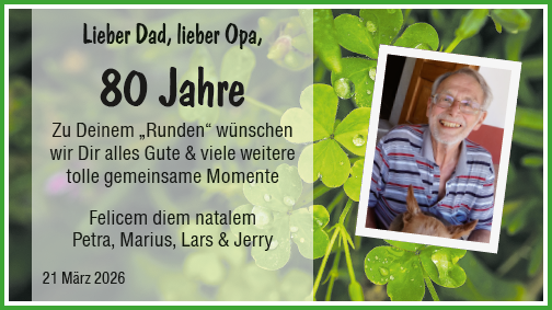 Lieber Dad, lieber Opa, 8 Lieber Dad, lieber Opa, 80 Jahre Zu Deinem Runden wünschen wir Dir alles Gute & viele weitere tolle gemeinsame Momente Felicem diem natalem Petra, Marius, Lars & Jerry 21 März 2026Das könnte Sie auch interessieren