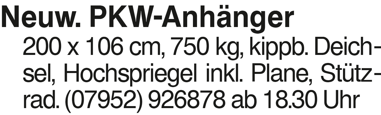 Neuw. PKW-Anhänger 200 x Neuw. PKW-Anhänger 200 x 106 cm, 750 kg, kippb. Deichsel, Hochspriegel inkl. Plane, Stützrad. (07952) 926878 ab 18.30 Uhr