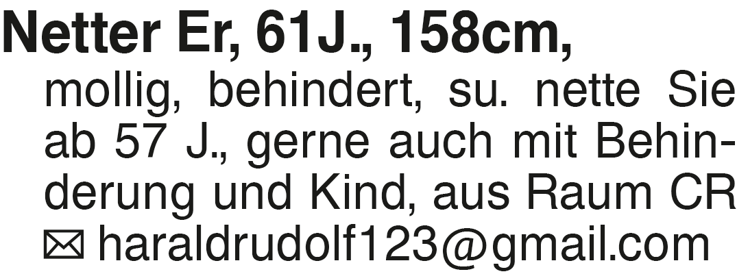 Netter Er, 61J., 158cm, m Netter Er, 61J., 158cm, mollig, behindert, su. nette Sie ab 57 J., gerne auch mit Behinderung und Kind, aus Raum CR haraldrudolf123@gmail.comDas könnte Sie auch interessieren
