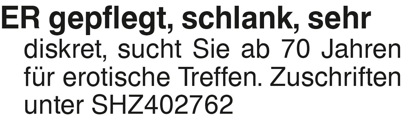 Er sucht Sie ER gepflegt, schlank, sehr diskret, sucht Sie ab 70 Jahren für erotische Treffen. Zuschriften unter SHZ402762Das könnte Sie auch interessieren