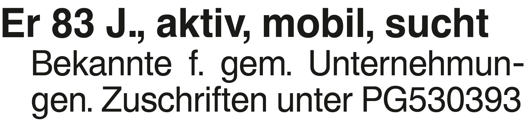 Er 83 J., aktiv, mobil, s Er 83 J., aktiv, mobil, sucht Bekannte f. gem. Unternehmungen. Zuschriften unter PG530393Das könnte Sie auch interessieren