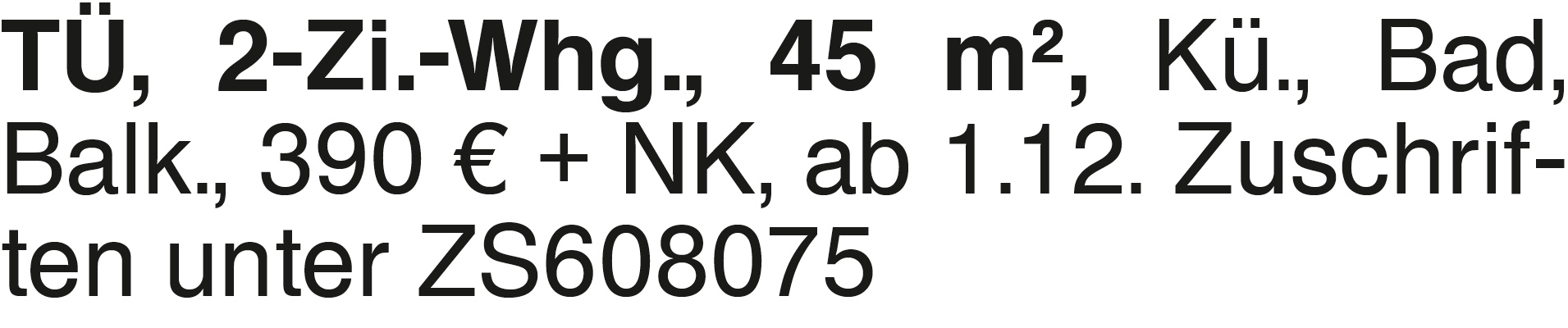TÜ, 2-Zi.-Whg., 45 m2, Kü TÜ, 2-Zi.-Whg., 45 m2, Kü., Bad, Balk., 390 EUR + NK, ab 1.12. Zuschriften unter ZS608075Das könnte Sie auch interessieren