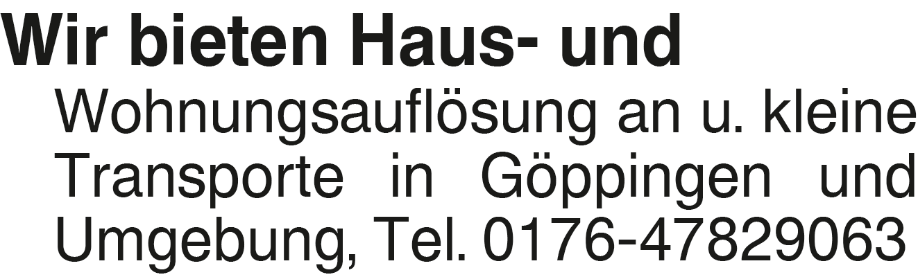 Wohnungsauflösung Wir bieten Haus- und Wohnungsauflösung an u. kleine Transporte in Göppingen und Umgebung, Tel. 0176-47829063Das könnte Sie auch interessieren