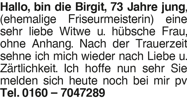 Hallo, bin die Birgit Hallo, bin die Birgit, 73 Jahre jung, (ehemalige Friseurmeisterin) eine sehr liebe Witwe u. hübsche Frau, ohne Anhang. Nach der Trauerzeit sehne ich mich wieder nach Liebe u. Zärtlichkeit. Ich hoffe nun sehr Sie melden sich heute noch bei mir pv Tel. 0160 # 7047289Das könnte Sie auch interessieren