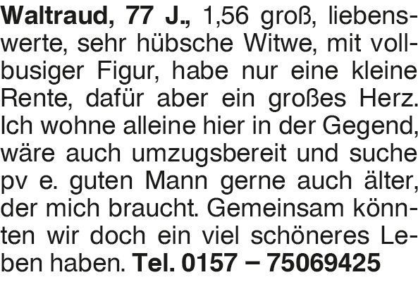Waltraud, 77 J., Waltraud, 77 J., 1,56 groß, liebenswerte, sehr hübsche Witwe, mit vollbusiger Figur, habe nur eine kleine Rente, dafür aber ein großes Herz. Ich wohne alleine hier in der Gegend, wäre auch umzugsbereit und suche pv e. guten Mann gerne auch älter, der mich braucht. Gemeinsam könnten wir doch ein viel schöneres Leben haben. Tel. 0157 # 75069425Das könnte Sie auch interessieren