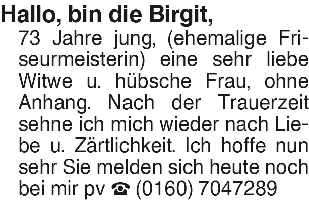 Hallo, bin die Birgit, 73 Hallo, bin die Birgit, 73 Jahre jung, (ehemalige Friseurmeisterin) eine sehr liebe Witwe u. hübsche Frau, ohne Anhang. Nach der Trauerzeit sehne ich mich wieder nach Liebe u. Zärtlichkeit. Ich hoffe nun sehr Sie melden sich heute noch bei mir pv (0160) 7047289Das könnte Sie auch interessieren