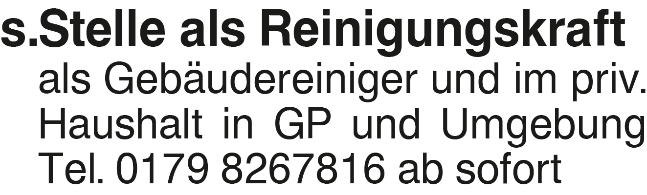 Gebäudereinigung s.Stelle als Reinigungskraft als Gebäudereiniger und im priv. Haushalt in GP und Umgebung Tel. 0179 8267816 ab sofortDas könnte Sie auch interessieren