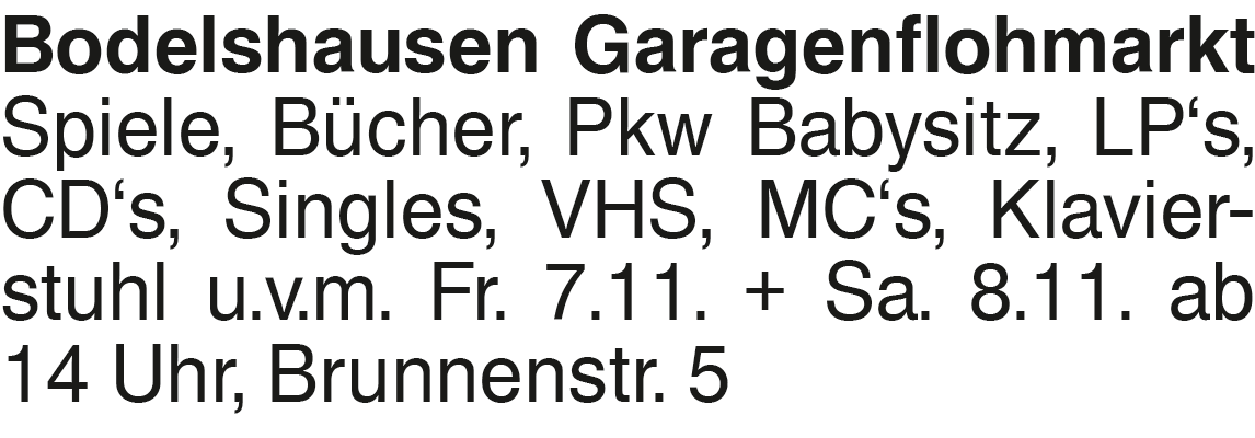 Bodelshausen Garagenflohm Bodelshausen Garagenflohmarkt Spiele, Bücher, Pkw Babysitz, LP s, CD s, Singles, VHS, MC s, Klavierstuhl u.v.m. Fr. 7.11. + Sa. 8.11. ab 14 Uhr, Brunnenstr. 5Das könnte Sie auch interessieren