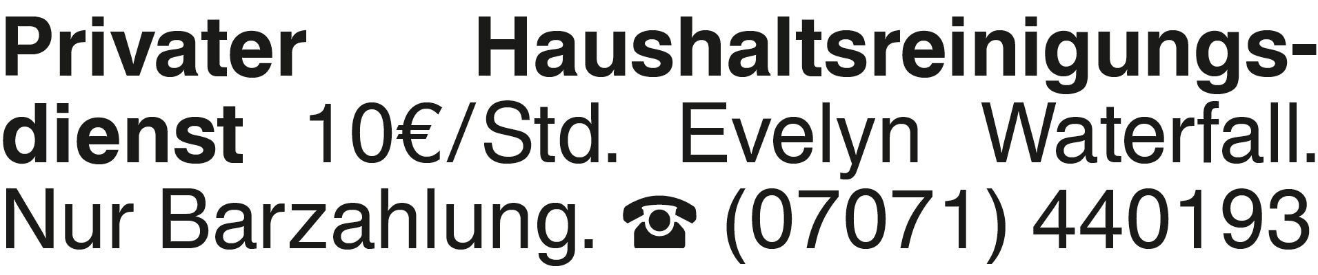 Privater Haushaltsreinigu Privater Haushaltsreinigungsdienst 10 EUR/Std. Evelyn Waterfall. Nur Barzahlung. (07071) 440193Das könnte Sie auch interessieren