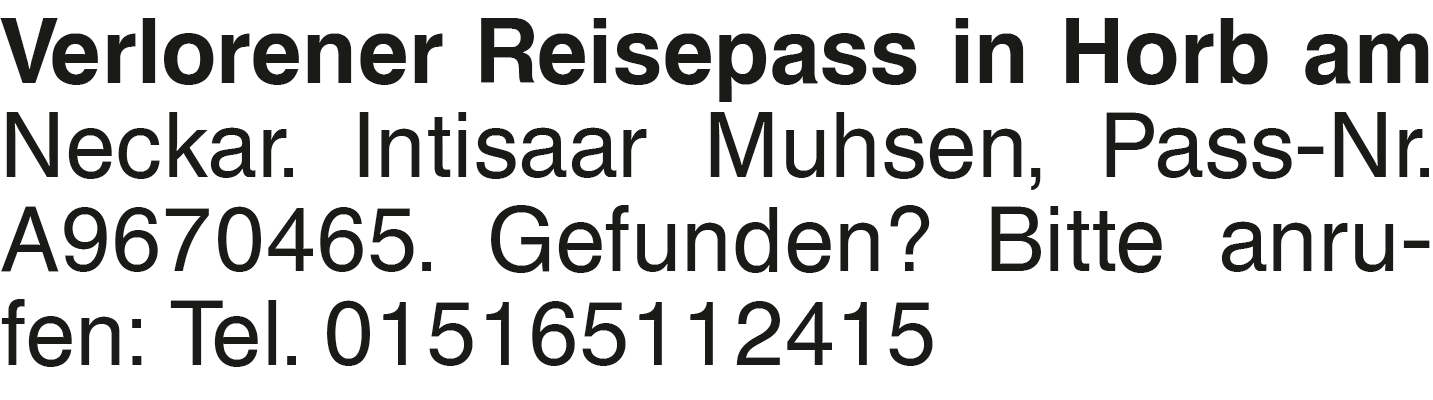 Verlorener Reisepass in H Verlorener Reisepass in Horb am Neckar. Intisaar Muhsen, Pass-Nr. A9670465. Gefunden? Bitte anrufen: Tel. 015165112415