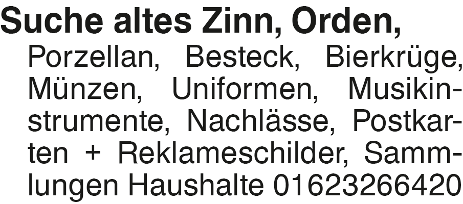 Suche altes Zinn, Orden, Suche altes Zinn, Orden, Porzellan, Besteck, Bierkrüge, Münzen, Uniformen, Musikinstrumente, Nachlässe, Postkarten + Reklameschilder, Sammlungen Haushalte 01623266420Das könnte Sie auch interessieren