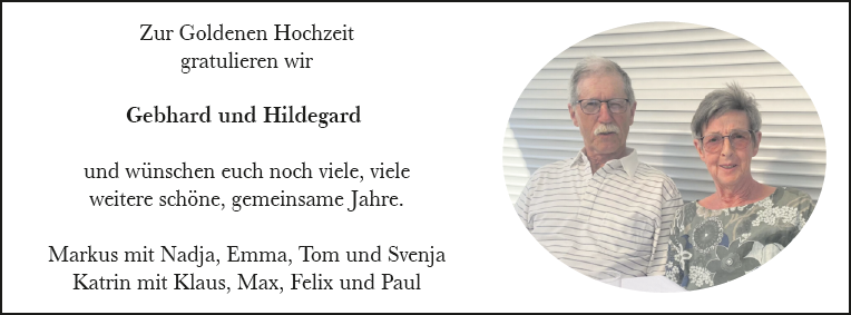Zur Goldenen Hochzeit gra Zur Goldenen Hochzeit gratulieren wir Gebhard und Hildegard und wünschen euch noch viele, viele weitere schöne, gemeinsame Jahre. Markus mit Nadja, Emma, Tom und Svenja Katrin mit Klaus, Max, Felix und PaulDas könnte Sie auch interessieren