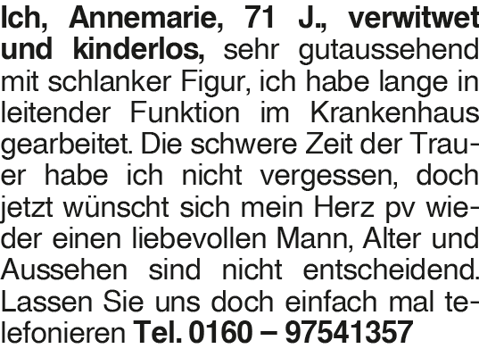 Ich, Annemarie, 71 J., Ich, Annemarie, 71 J., verwitwet und kinderlos, sehr gutaussehend mit schlanker Figur, ich habe lange in leitender Funktion im Krankenhaus gearbeitet. Die schwere Zeit der Trauer habe ich nicht vergessen, doch jetzt wünscht sich mein Herz pv wieder einen liebevollen Mann, Alter und Aussehen sind nicht entscheidend. Lassen Sie uns doch einfach mal telefonieren Tel. 0160 # 97541357Das könnte Sie auch interessieren