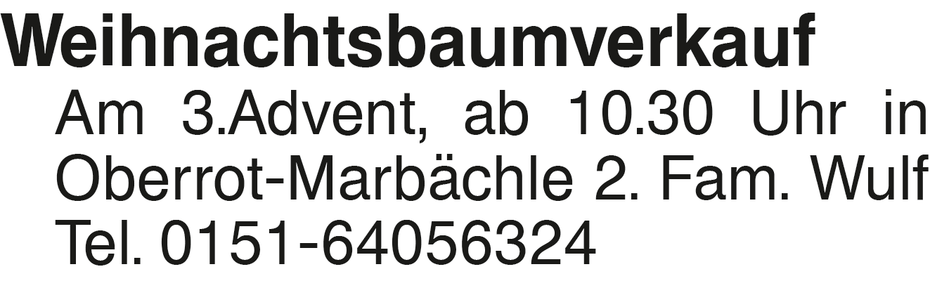 Weihnachtsbaumverkauf Am Am 3.Advent, ab 10.30 Uhr in Oberrot-Marbächle 2. Fam. Wulf Tel. 0151-64056324Das könnte Sie auch interessieren