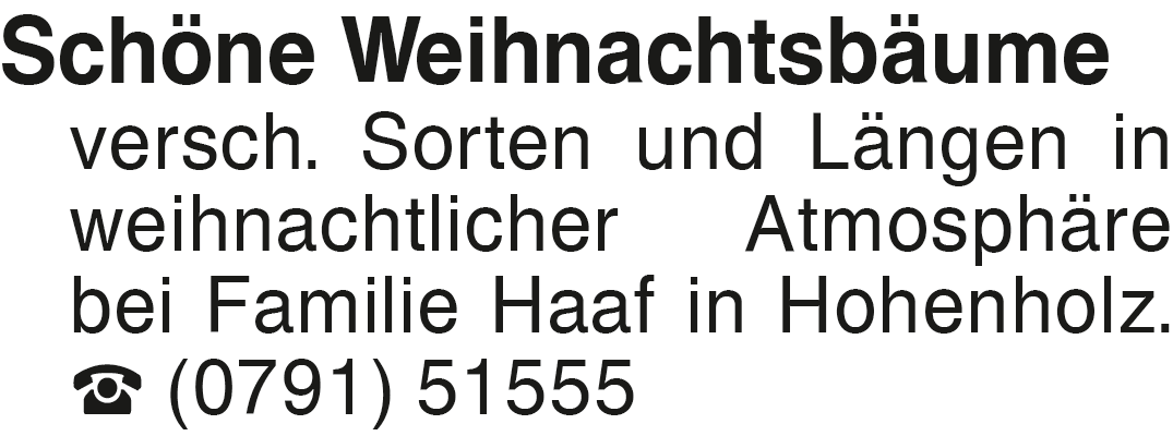 Schöne Weihnachtsbäume ve Schöne Weihnachtsbäume versch. Sorten und Längen in weihnachtlicher Atmosphäre bei Familie Haaf in Hohenholz. (0791) 51555Das könnte Sie auch interessieren