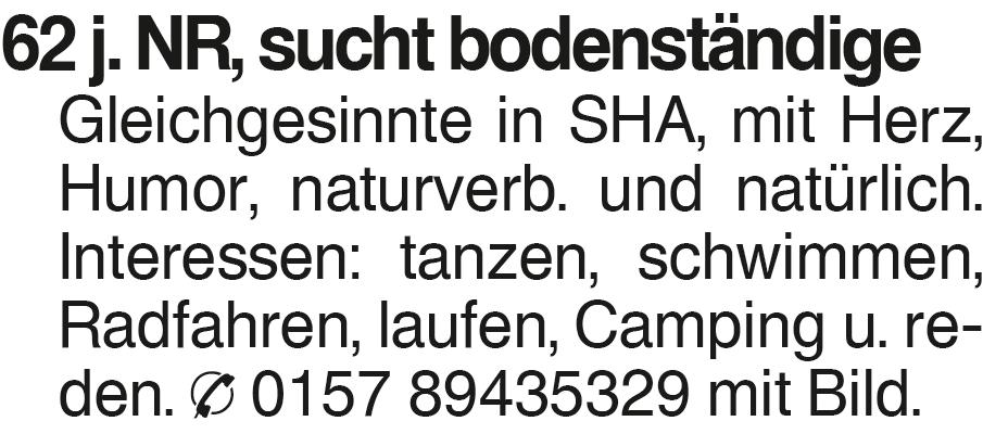 62 j. NR 62 j. NR, sucht bodenständige Gleichgesinnte in SHA, mit Herz, Humor, naturverb. und natürlich. Interessen: tanzen, schwimmen, Radfahren, laufen, Camping u. reden. 0157 89435329 mit Bild.Das könnte Sie auch interessieren