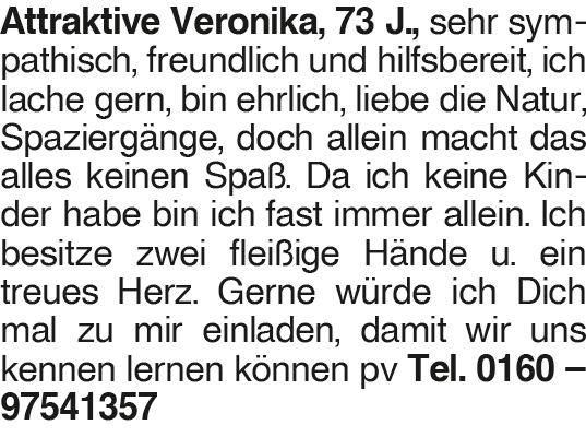 Attraktive Veronika, 73 J., Attraktive Veronika, 73 J., sehr sympathisch, freundlich und hilfsbereit, ich lache gern, bin ehrlich, liebe die Natur, Spaziergänge, doch allein macht das alles keinen Spaß. Da ich keine Kinder habe bin ich fast immer allein. Ich besitze zwei fleißige Hände u. ein treues Herz. Gerne würde ich Dich mal zu mir einladen, damit wir uns kennen lernen können pv Tel. 0160 # 97541357Das könnte Sie auch interessieren
