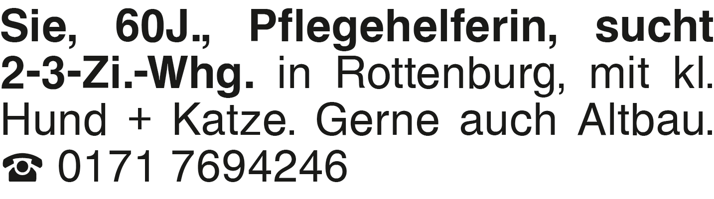 Sie, 60J., Pflegehelferin Sie, 60J., Pflegehelferin, sucht 2-3-Zi.-Whg. in Rottenburg, mit kl. Hund + Katze. Gerne auch Altbau. 0171 7694246Das könnte Sie auch interessieren