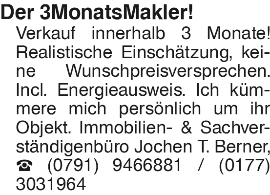 Der 3MonatsMakler! Verkau Der 3MonatsMakler! Verkauf innerhalb 3 Monate! Realistische Einschätzung, keine Wunschpreisversprechen. Incl. Energieausweis. Ich kümmere mich persönlich um ihr Objekt. Immobilien- & Sachverständigenbüro Jochen T. Berner, (0791) 9466881 / (0177) 3031964Das könnte Sie auch interessieren