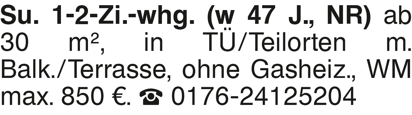Su. 1-2-Zi.-whg. (w 47 J. Su. 1-2-Zi.-whg. (w 47 J., NR) ab 30 m2, in TÜ/Teilorten m. Balk./Terrasse, ohne Gasheiz., WM max. 850 EUR. 0176-24125204Das könnte Sie auch interessieren