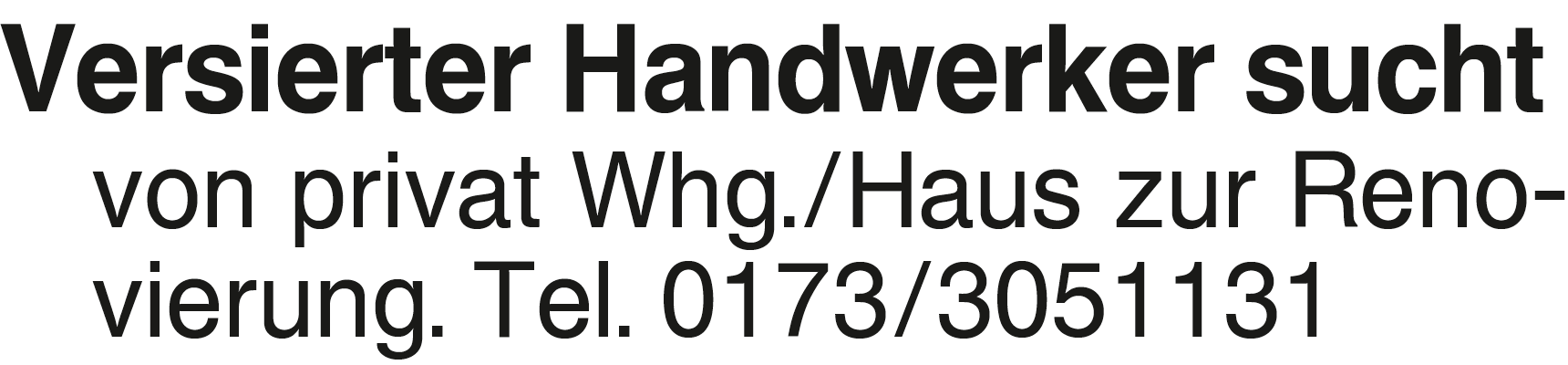 Versierter Handwerker suc Versierter Handwerker sucht von privat Whg./Haus zur Renovierung. Tel. 0173/3051131Das könnte Sie auch interessieren