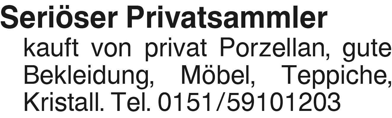 Seriöser Privatsammler ka Seriöser Privatsammler kauft von privat Porzellan, gute Bekleidung, Möbel, Teppiche, Kristall. Tel. 0151/59101203Das könnte Sie auch interessieren