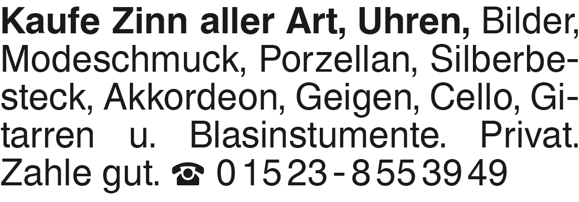 Kaufe Zinn Kaufe Zinn aller Art, Uhren, Bilder, Modeschmuck, Porzellan, Silberbesteck, Akkordeon, Geigen, Cello, Gitarren u. Blasinstumente. Privat. Zahle gut. 0 15 23 - 8 55 39 49Das könnte Sie auch interessieren