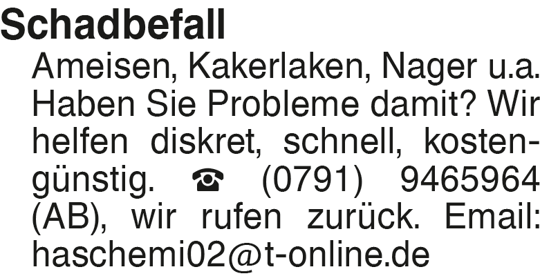 Schadbefall Ameisen, Kake Schadbefall Ameisen, Kakerlaken, Nager u.a. Haben Sie Probleme damit? Wir helfen diskret, schnell, kostengünstig. (0791) 9465964 (AB), wir rufen zurück. Email: haschemi02@t-online.deDas könnte Sie auch interessieren
