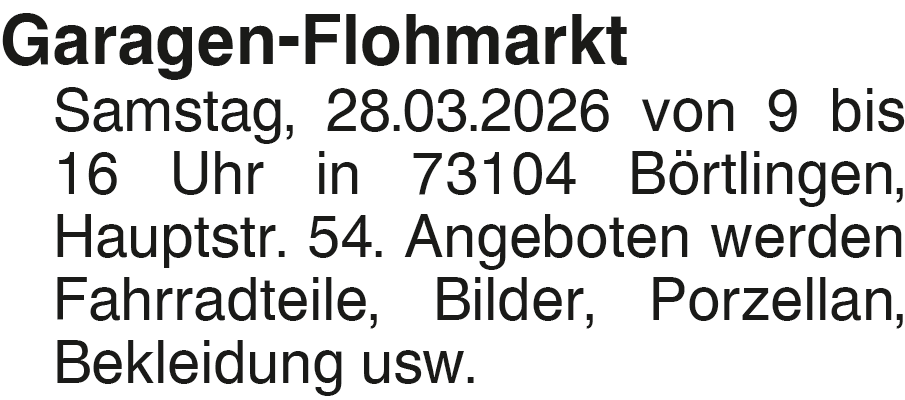 Garagen-Flohmarkt Samstag Am Samstag, 28.03.2026 von 9 bis 16 Uhr in 73104 Börtlingen, Hauptstr. 54. Angeboten werden Fahrradteile, Bilder, Porzellan, Bekleidung usw.Das könnte Sie auch interessieren
