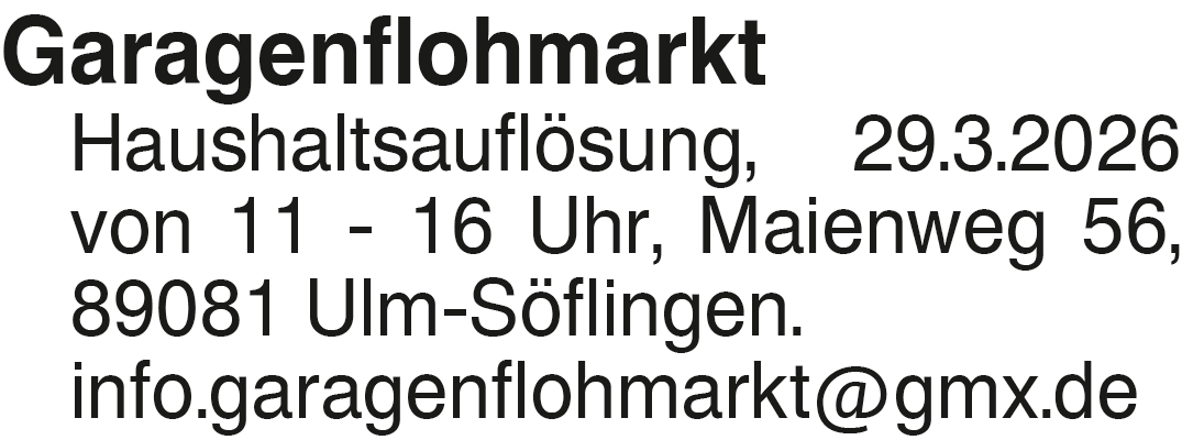 Garagenflohmarkt Haushalt Haushaltsauflösung, 29.3.2026 von 11 - 16 Uhr, Maienweg 56, 89081 Ulm-Söflingen info.garagenflohmarkt@gmx.deDas könnte Sie auch interessieren