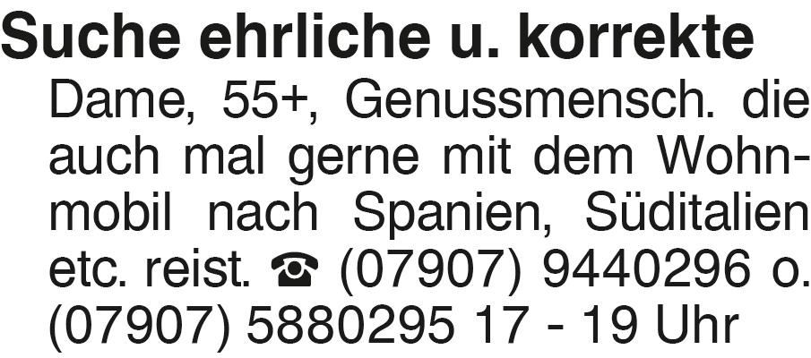 Suche ehrliche u. korrekt Suche ehrliche u. korrekte Dame, 55+, Genussmensch. die auch mal gerne mit dem Wohnmobil nach Spanien, Süditalien etc. reist. (07907) 9440296 o. (07907) 5880295 17 - 19 UhrDas könnte Sie auch interessieren