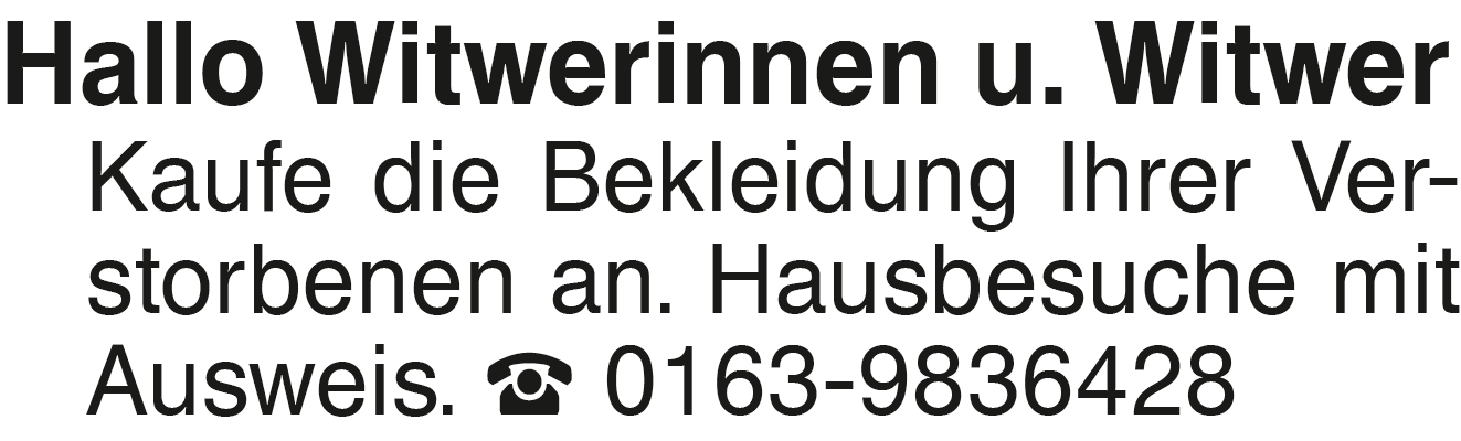 Hallo Witwerinnen u. Witw Hallo Witwerinnen u. Witwer Kaufe die Bekleidung Ihrer Verstorbenen an. Hausbesuche mit Ausweis. 0163-9836428