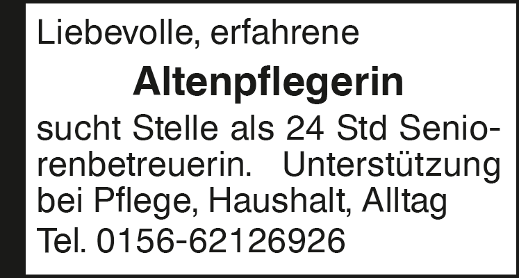 Liebevolle, erfahrene Alt Altenpflegerin sucht Stelle als 24 Std Seniorenbetreuerin Tel. 0156-62126926