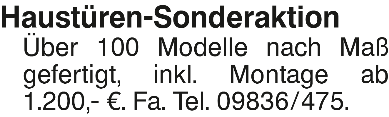 Haustüren-Sonderaktion Üb Haustüren-Sonderaktion Über 100 Modelle nach Maß gefertigt, inkl. Montage ab 1.200,- EUR. Fa. Tel. 09836/475.