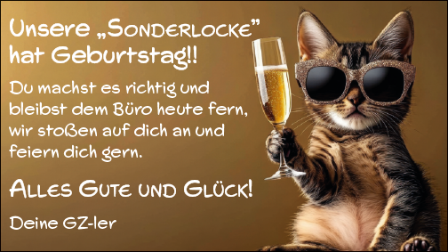 Gumo Svea Unsere ?Sonderlocke? hat Geburtstag!! Du machst es richtig und bleibst dem Büro heute fern, wir stoßen auf dich an und feiern dich gern. Alles Gute und Glück! Deine GZ-lerDas könnte Sie auch interessieren