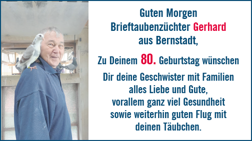 Guten Morgen Anzeige Guten Morgen Brieftaubenzüchter Gerhard aus Bernstadt, Zu Deinem 80. Geburtstag wünschen Dir deine Geschwister mit Familien alles Liebe und Gute, vorallem ganz viel Gesundheit sowie weiterhin guten Flug mit deinen Täubchen.Das könnte Sie auch interessieren