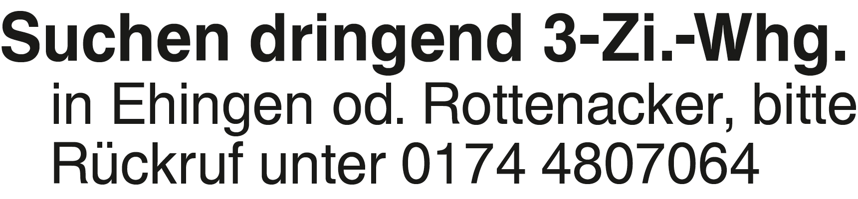 Suchen dringend 3-Zi.-Whg Suchen dringend 3-Zi.-Whg. in Ehingen od. Rottenacker, bitte Rückruf unter 0174 4807064Das könnte Sie auch interessieren