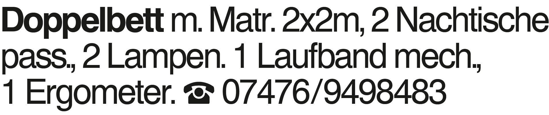 Doppelbett Doppelbett m. Matr. 2x2m, 2 Nachtische pass., 2 Lampen. 1 Laufband mech., 1 Ergometer. 07476/9498483Das könnte Sie auch interessieren