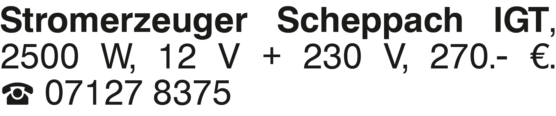 Stromerzeuger Scheppach Stromerzeuger Scheppach IGT, 2500 W, 12 V + 230 V, 270.- EUR. 07127 8375Das könnte Sie auch interessieren