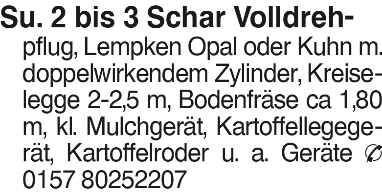 Su. 2 bis 3 Schar Volldre Su. 2 bis 3 Schar Volldreh- pflug, Lempken Opal oder Kuhn m. doppelwirkendem Zylinder, Kreiselegge 2-2,5 m, Bodenfräse ca 1,80 m, kl. Mulchgerät, Kartoffellegegerät, Kartoffelroder u. a. Geräte 0157 80252207Das könnte Sie auch interessieren